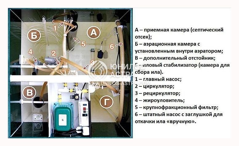 Юнилос Астра 6 — очень популярная модель биологической станции очистки для частных домовладений. Она компактна, проста в монтаже, эффективно работает и долго служит (в конструкции отсутствуют механические узлы, поэтому «ломаться нечему»).